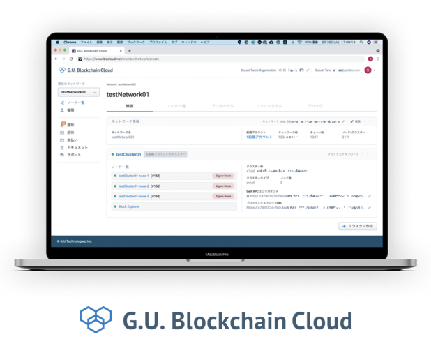 「G.U.Blockchain Cloud」では、世界標準のブロックチェーン開発インフラとなりつつあるEthereum互換のプライベートチェーン、コンソーシアムチェーンを「誰でも簡単・低コスト」に構築できるクラウドサービスの提供を目指して開発されました。導入により、おもにEnterpriseブロックチェーン領域において、自社ブロックチェーンの構築・運用コストを大幅に削減することができる上、Ethererumのエコシステムの恩恵をうけながらも安全に自社コントロール可能なブロックチェーンビジネスを推進していくことが可能です。